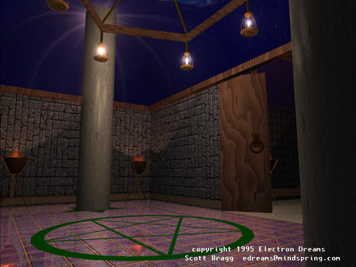 | This is the best overall view of the room. Visible are the wooden doors leading out to the candle lit hallway, as well as a vast expanse of tiled floor. In the center of the floor can be seen a large inlaid symbol of the four ancient elements; Earth, Wind, Air, and Fire; with the fifth point representing spirit. | ![]() |